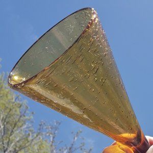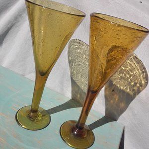 Vintage Golden Wine Goblets Bubble Glass Handmade Signed French Artist France Hand Blown Gold Colored Art Glass Bubble Glass Wine Glasses Drinking Glasses French Artist Biot etched their signature on stem base. Art glass set of 2 Blown Glass Hand Made Hand thrown. Wonderful Wedding Gift idea! Gold Wine or champagne glasses wonderful gift idea bubbles galore!