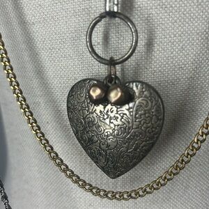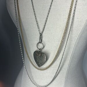Layered silver and gold chains with a hanging heart pendant