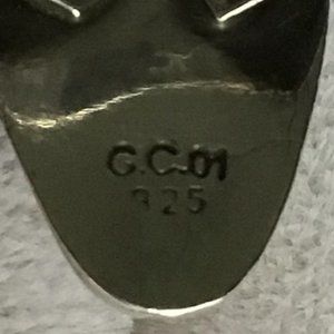 This sterling silver, and what I believe is goldstone, modernist ring is stamped G.C.01 925. Based on my researched, it is likely from one of Mexico's most sought after designers, Pepe Cerroblanco. He studied jewelry design in Italy. All his jewelry is handcrafted of gold or sterling silver. Apparently his early work is difficult to find.