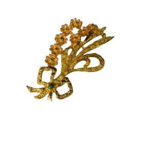 Vintage Goldtone Floral Spray Brooch 3" Pink Green Enameled
