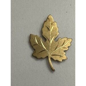 Classic vintage brooch in the shape of a maple leaf with etched and dotted vein details. The goldtone finish gives it a timeless look, making it a versatile accessory for coats, scarves, or jackets.
