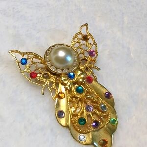 faux pearl and multi colored Rhinestones adorn the Brooche