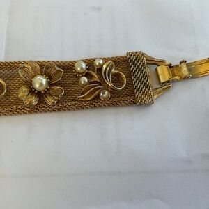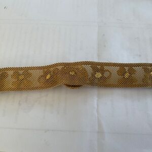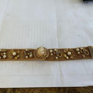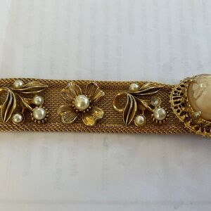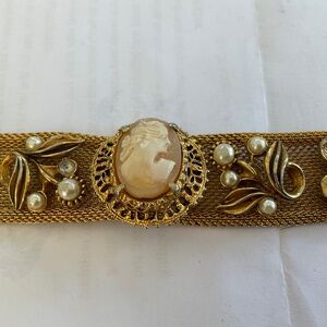 Gold tone cameo bracelet with mesh band. No missing stones.Some discoloration on band. Clasp works as it should.True vintage.9 in.long and 1 in.wide.Fast ship!