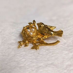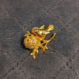 Vintage Goldtone Bird with Nest Brooche Faux Pearl Accents