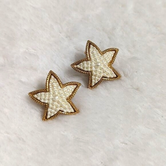 These are so cute, vintage faux pearl starfish pierced earrings rimmed in beaded goldtone.