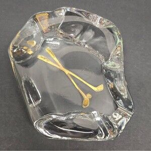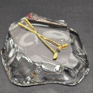 Vintage Golf Clubs And Ball Paperweight Clear Crystal Glass Gold Tone Metal