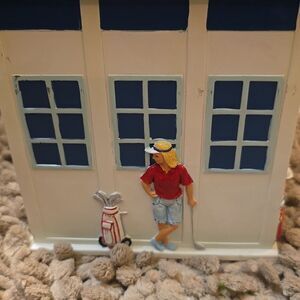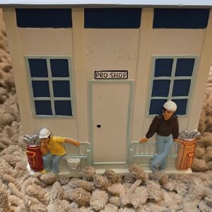 Vintage golf theme resin tissue box cover blue white red yellow various golfers and caddies in different poses as well as golf cart is part of the scene 7 1/2 inches tall by 5 1/2 inches, fits tissue box perfectly, great for any golf enthusiasts office bedroom bath or as a housewarming gift, excellent condition, no chips or cracks