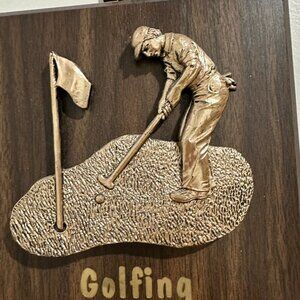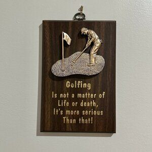 Vintage A+F golfer's plaque. Dark faux wood with a 3-D gold hued golfer illustrated above the words: "Golfing. A bad day of golf Is still better than A good day at work." Hook for hanging is attached to the top. Made in Canada.
