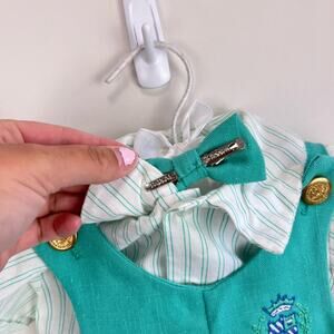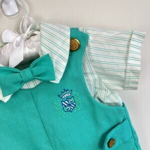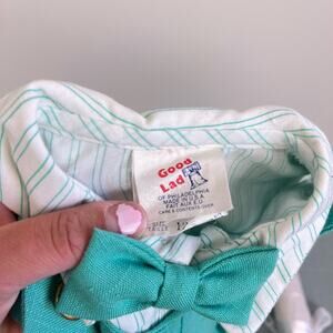 Vintage Good Lad Green Shortall Romper Set. Baby boy size 12 months. Made in the USA. Three piece outfit includes sleeveless jon jon style overalls, clip on bow tie, and striped collared short sleeve shirt. Perfect for a special occasion!