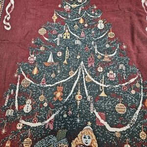 In excellent condition Vintage Goodwin Weavers Maroon Tapestry Christmas Tree Fringed Throw Blanket.