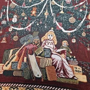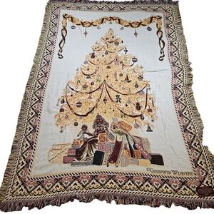 Features vintage Goodwin Weavers tapestry style knit throw blanket, adorned with Victorian inspired Christmas tree with a girl surrounded by presents, contrasting heart trim with fringed edges, extra large holiday throw blanket.