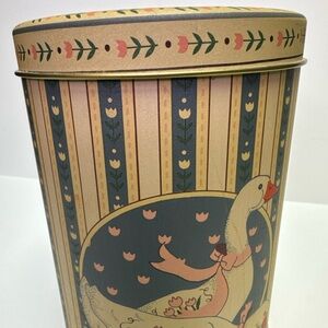 Charming tin with a goose design. Features blue and cream colors.