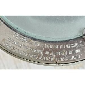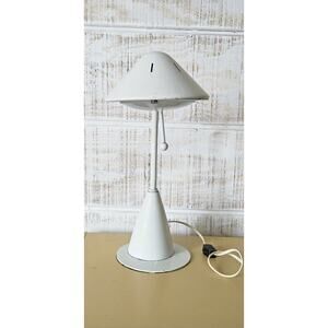 This vintage desk lamp from Underwriters Laboratories is a stylish addition to any workspace. The lamp features a sleek, geometric design with a goose neck for adjustable lighting. It is made of durable metal and has a cone-shaped shade in classic white color. The brightness of the light has two settings.