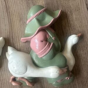 Charming wall decor featuring figures in pink and green with white geese. Perfect for adding a vintage touch to any room.