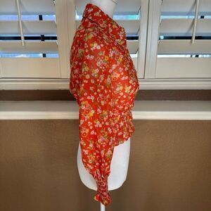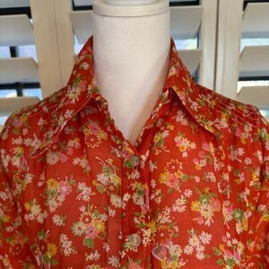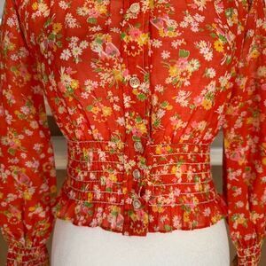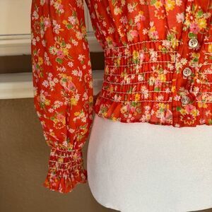 Vintage Gordon Peters Size 5 Smocked Floral Crop Blouse Orange Retro Semi Sheer
