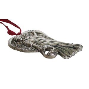 This exquisite Gorham silver-plated ornament showcases a finely detailed angel within a heart, adorned with a "Love" inscription. The craftsmanship is impeccable, making it a refined addition to holiday decor or a cherished gift for loved ones. A red ribbon adds a touch of elegance for easy hanging.