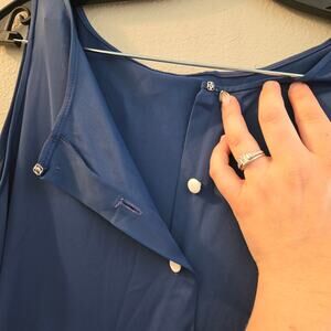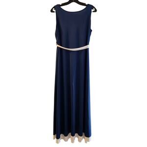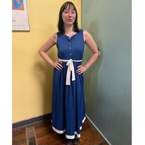 Navy blue tank top maxi length 100% nylon night gown with white hem trim, belt, and front buttons. Made in the USA Style 5011 in perfect condition! Measures approximately 19" flat under arms and 53" full length. Top includes snap, two functional buttons, and two decorative buttons.