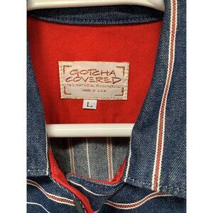 Vintage Gotcha Covered Womens Large Denim Jacket Blue Red Patriotic Lightweight