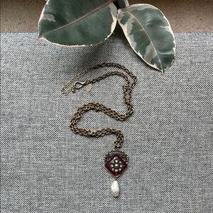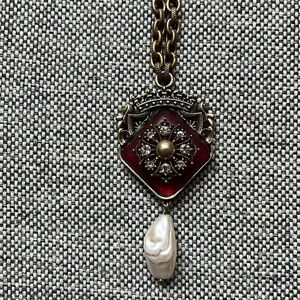 Vintage Gothic Red glass pendant necklace with pearl detailing and brass chain