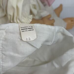 Condition: Good used condition with light general wear. Some faint marks visible on the fabric; no tears or major flaws noted. Dress and bonnet have age-related signs but overall clean appearance.