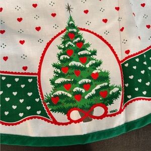 Vintage Gourmet Gallery Christmas apron, perfect for holiday baking! Features a festive tree with red heart ornaments, red hearts, and green dots on a white background. Green border with white hearts, red scalloped trim, and quilted green ties. 65% polyester, 35% cotton, made in USA. Gently used, great condition with light wrinkles. Add retro charm to your kitchen!
