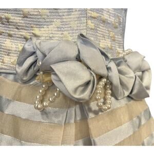 A gold lame and tulle underskirt has a blue and silvery semi-sheer stripe fabric overlay on the skirt. The fitted bodice is made of beautiful floral and striped fabric in the same colors.