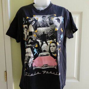 Vintage Graceland Elvis Presley Collage Graphic T-Shirt Size Medium - unisex but fits more like a women's. Scoop neck, short sleeves, black. Graphic on the front with some slight wear/cracking as shown. Minimal wear from preowned condition. Elvis Presley written at the bottom and graphic consisting of multiple photos of Elvis younger with his signature pink Cadillac car. Photo collage style. Unsure of year but looks and feels like a vintage shirt. 100% cotton preshrunk. Music shirt, band shirt. Merch.