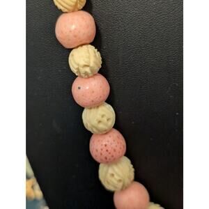 Vintage Graduated Carved Celluloid & Pink Coral Bead Broken Clasp 32" Necklace. Pre-owned, this necklace is in good vintage condition except the clasp needs fixed and the celluloid needs cleaned in some areas.