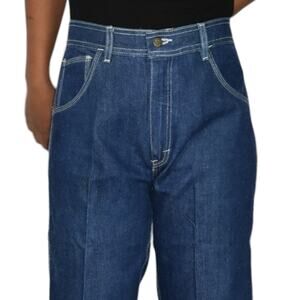 Vintage 80s Graffiti jeans FEATURE embroidery pockets with a high rise waist and contrast stitching. Straight legs. Dark wash. Beige contrast stitching. Rigid no stretch.