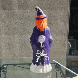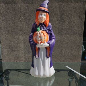 Vintage Grand Venture witch blowmold featuring a unique purple redhead design. Perfect for Halloween decor enthusiasts. Made in the USA, this rare collectible will add a touch of nostalgia to your holiday setup.