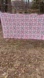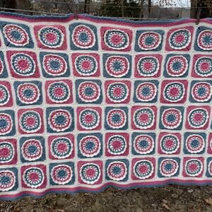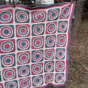 Rectangle shape, beautiful granny squares with alternating pink and blue designs. Cute raised flower petal trim stitching on the squares.