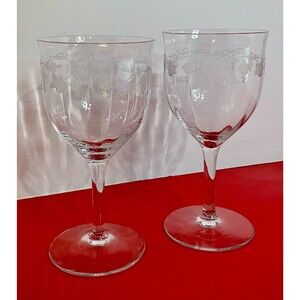 Vintage Grape Etch Wine Glass Goblet (s) LOT OF 2 Vine Leaf Optic Crystal
