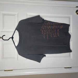 Casual charcoal tee with coral graphic design. Soft fabric. Relaxed fit.