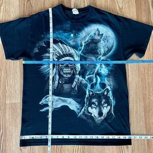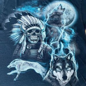 Super cool Perfectly faded and soft black vintage T-shirt with full moon, skull in headdress, and howling wolves. Size tag worn out measures like a small. Please see photos for measurements. Has Harley vibes.