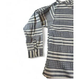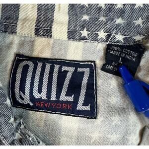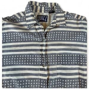 This vintage Quizz long sleeve button-up, size large, features a unique Americana-inspired design with stars in shades of gray, beige, and tan. It's a perfect blend of casual style and patriotic flair, making it a versatile addition to any wardrobe.
