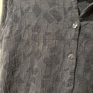Stylish gray button-up shirt with a subtle pattern. Perfect for casual wear. Cotton Blend, unique buttons, with pockets