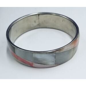 Vintage Gray & Pink Dyed Abalone Shells Silvertone Bangle Bracelet Vintage1970s E543