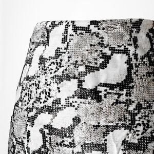 A gray satin midi bodycon pencil skirt featuring a snake print. Zips up on the side. Unlined. Curated from our own Haulace label collection