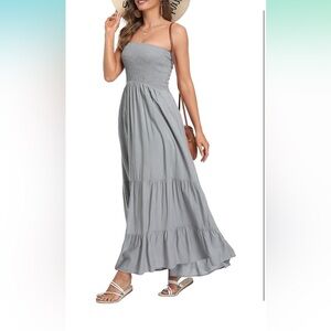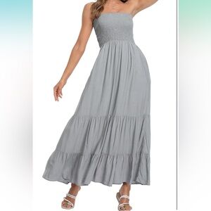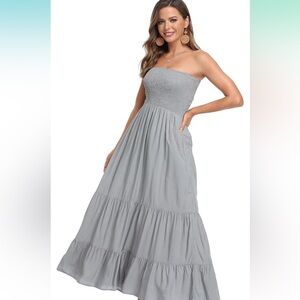 This elegant gray strapless maxi dress is perfect for any occasion. Its flowing design offers both comfort and style. Ideal for a chic, sophisticated look