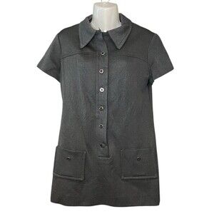 This vintage gray trapeze short sleeve mini dress is a handcrafted piece that exudes a 60s vibe. It features a collared neckline, button closure, and accent buttons that add a touch of elegance to its overall design. The dress is made of a comfortable polyester blend French Terry fabric that is perfect for any occasion, whether it's a casual day out, a formal event, or a cocktail party.