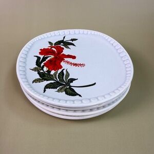 Beautifully vibrant vintage bread or dessert plates from the Gray-Lure line by Crooksville Pottery Co., made in the U.S.A. These mid-century ceramic plates feature a striking red hibiscus motif with lush green foliage, framed by a beaded raised edge. A true statement set for collectors or entertainers who appreciate classic American dinnerware with a bold botanical flair.