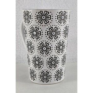 Tall ceramic coffee mug with flower pattern design. White in color with distinctive black and white abstract floral pattern with small dots set in the mug side. In great condition.