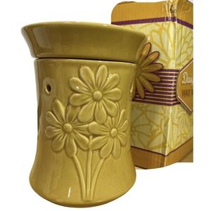 Vintage Great American Embossed Mustard Yellow Daisy Flower Electric Wax Warmer. Pre-Owned in very good condition. Electric wax warmer tested and works. Yellow mustard color with Daisy embossed graphics. For use with scented wax melts. Use's Small lamp bulb. Does not ship with bulb. Measures