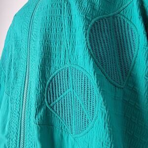 vintage jacket, Great Cavalier, Great Cavalier by St. Paul, teal jacket, vintage teal windbreaker, patchwork jacket, textured jacket, geometric design jacket, retro outerwear, 80s 90s vintage, boho jacket, artsy fashion, lightweight jacket, women's vintage jacket, statement jacket, festival jacket, oversized jacket, teal zip up jacket, elastic hem jacket, collared jacket, vintage streetwear