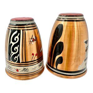 These hand-painted vintage Greek copper salt and pepper shakers feature intricate designs with a polished finish, offering both functionality and decorative appeal.