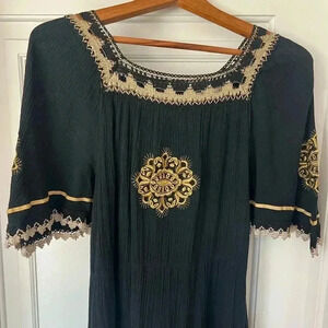Vintage Greek Embroidered Boho Dress - Black & Gold Cotton Midi size M