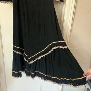 This black and gold vintage boho dress captures an effortlessly chic aesthetic, ideal for pairing with sandals, boots, or layered jewelry. Its timeless design and quality craftsmanship make it a standout addition to any wardrobe.