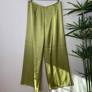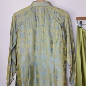 Vintage Unbranded Green 2 Piece Kaftan Kimono Style Mandarin Collar Silk Pants & Top Lounge Set. This set is shimmery and beautiful. Pants waist 17”, inseam 31”, rise 12” and pit to pit 20” and shoulder to hem 51 1/2”. Measurements are approximate and not exact. Wide leg trouser pants have rear zipper and Mandarin collar multi button and snap closure with long side seam slits. No brand, size or Material content on either piece. Beautiful with some very minor imperfections. Preowned vintage condition. Please review pictures and ask any questions prior to purchasing.