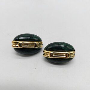 Elegant clip-on earrings featuring green acrylic with gold-tone accents. A vintage accessory that adds a refined touch to formal or professional attire.
