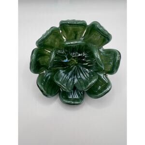 Striking vintage art glass decorative piece featuring a sculptural floral design in rich translucent green glass. Layered, petal-like forms create a dimensional flower shape that reflects light beautifully from every angle. The underside features clear ribbed glass elements that add visual contrast and depth.